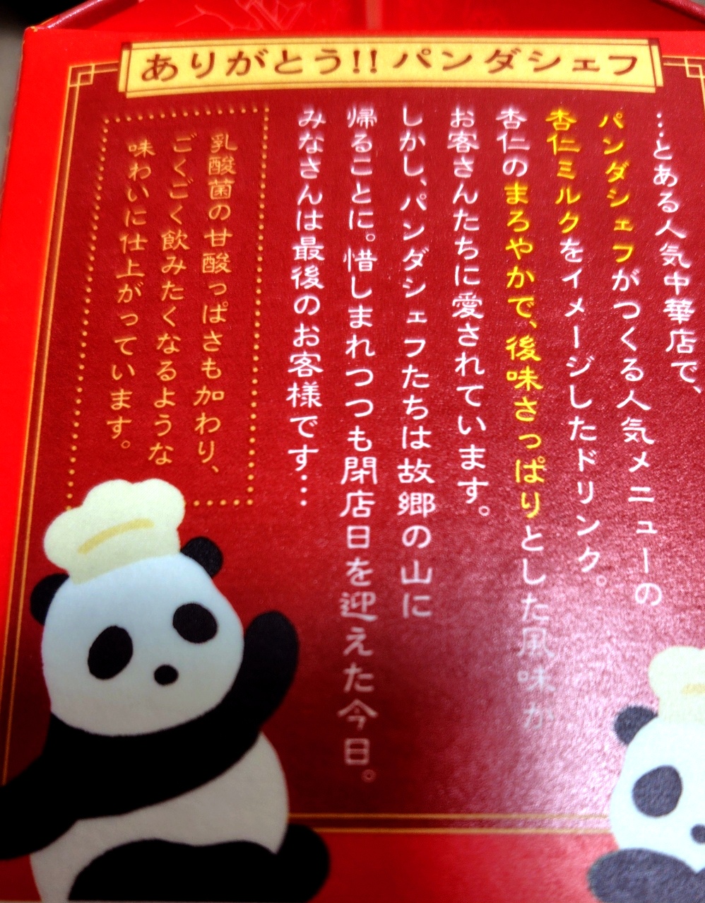 パンダシェフの杏仁ミルク風味 乳酸菌飲料 かわええ〜と思って買ったけどパッケージ横のエピソードにシュン…ってなった閉店しちゃうのか…(´;ω;`)値段は税込みで170円くらい(ローソン)味は杏仁豆腐味でうまかったです!さらっとしてて飲みやすい👍(バーコードが載ってたため再投稿 失礼しました)